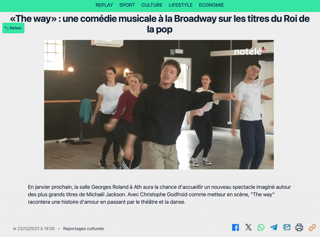 Reportage sur les coulisses du show "The Way" - Interview des chorégraphes Angélique Grard/Tom Godfroid et du metteur en scène Christophe Godfroid