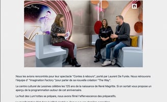 Interview de Christophe Godfroid & Angélique Grard sur les activités d'Imagination Factory. Au sommaire: "The Way" au Cirque Royal de Bruxelles, les auditions pour "The Way 2" et l'annonce du spectacle "Le Vent des Collines"